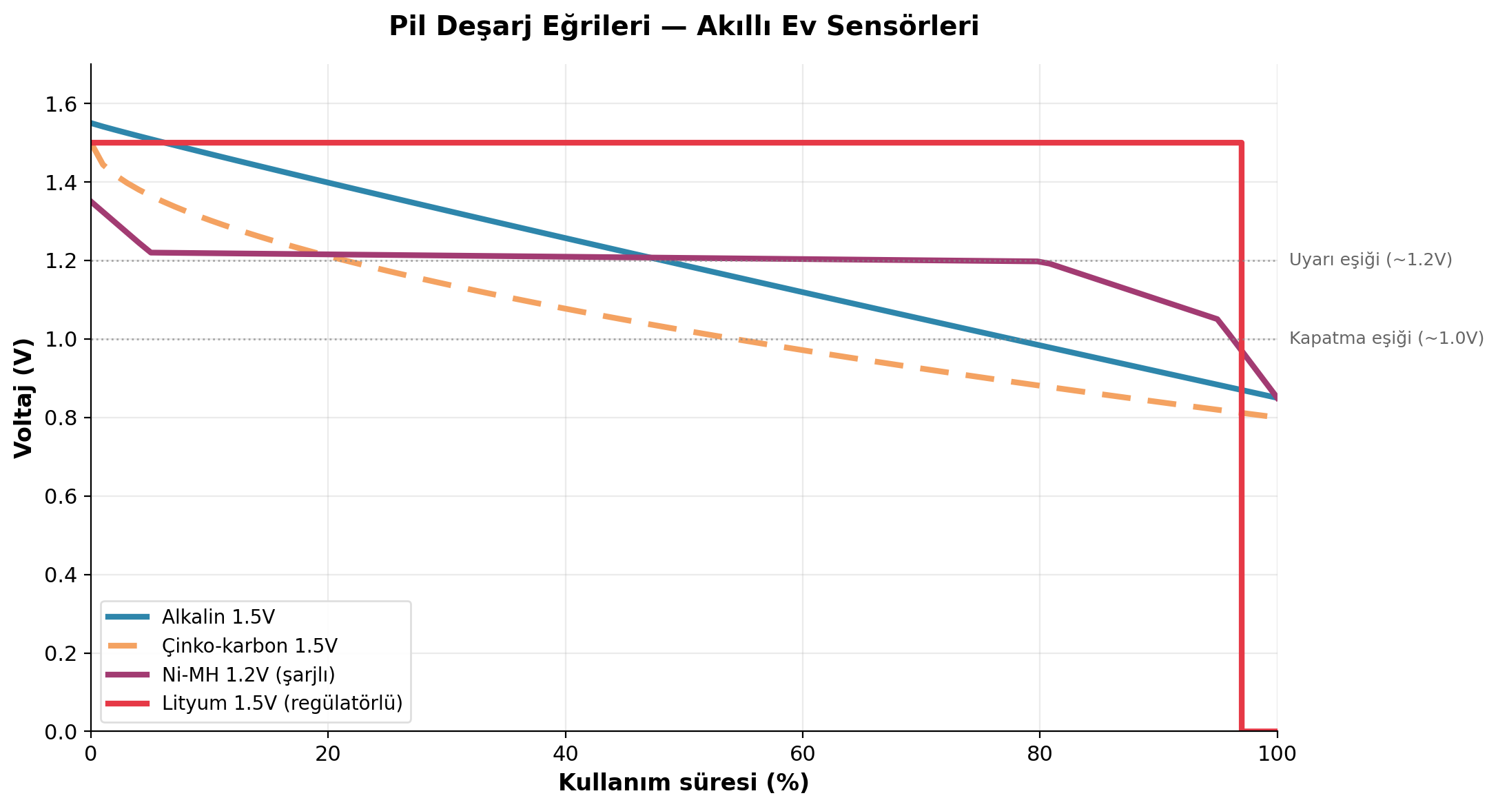 Çinko-karbon 1.5V — Hızlı Düşen Yokuş. Üzerinde aynı 1.5V yazsa da çinko-karbon pilin iç direnci yüksektir. Kullanmaya başladığınız anda voltaj hızla düşer ve ömrünün ilk yarısını bitirmeden 1.0V seviyesine yaklaşır. Akıllı sensör için bu, “yeni pil koyduktan birkaç hafta sonra düşük pil uyarısı” demektir.