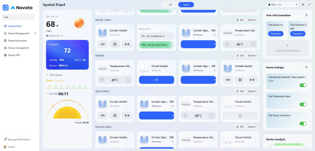 Tuya ekosistemine ait WiFi, Zigbee, Bluetooth tabanlı cihazlarınızı tek bir merkezden, web üzerinden yönetebileceğiniz bu yeni panel; bireysel kullanıcıdan kurumsal çözüm arayan profesyonele kadar geniş bir kitleye hitap ediyor. Akıllı ev kurulumunuzu Novato güvencesi ile yapıp bu panel üzerinden yönetmek ya da kurumsal teklif almak için novato.com.tr üzerinden ürünlerimizi inceleyebilir veya teklif formu doldurabilirsiniz.