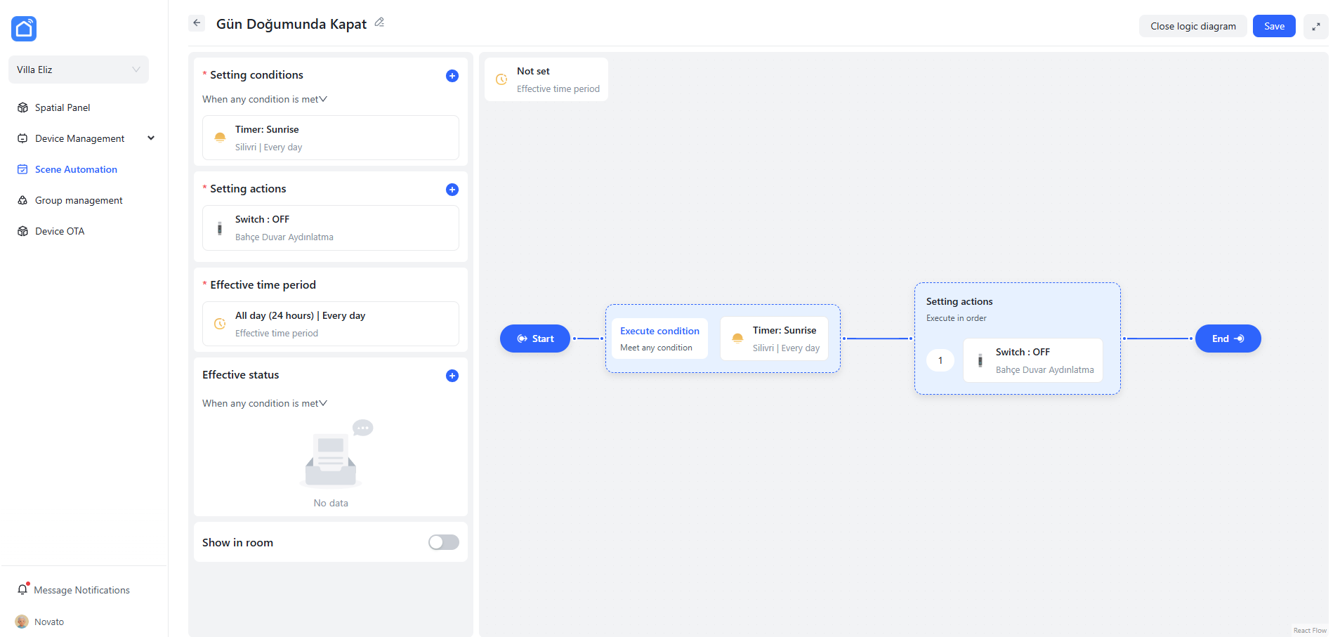 Bu koşullar birleştirilip “Setting actions” bölümünde tanımlanan eylemlerle eşleştirildiğinde — örneğin ZSB-01 Su Baskını Sensörü suyu algıladığında WKM02 kuru kontak rölesi ana vanayı kapatsın gibi — etki süresi (her gün 24 saat ya da belirli aralıklar) ve geçerlilik koşulları belirlenerek tam otomatik akıllı ev senaryoları oluşturuluyor. Oluşturduğunuz mantığı “View logic diagram” seçeneğiyle akış şeması olarak da görebiliyorsunuz; bu, karmaşık senaryoların hatasız kurgulanması için ciddi bir kolaylık.