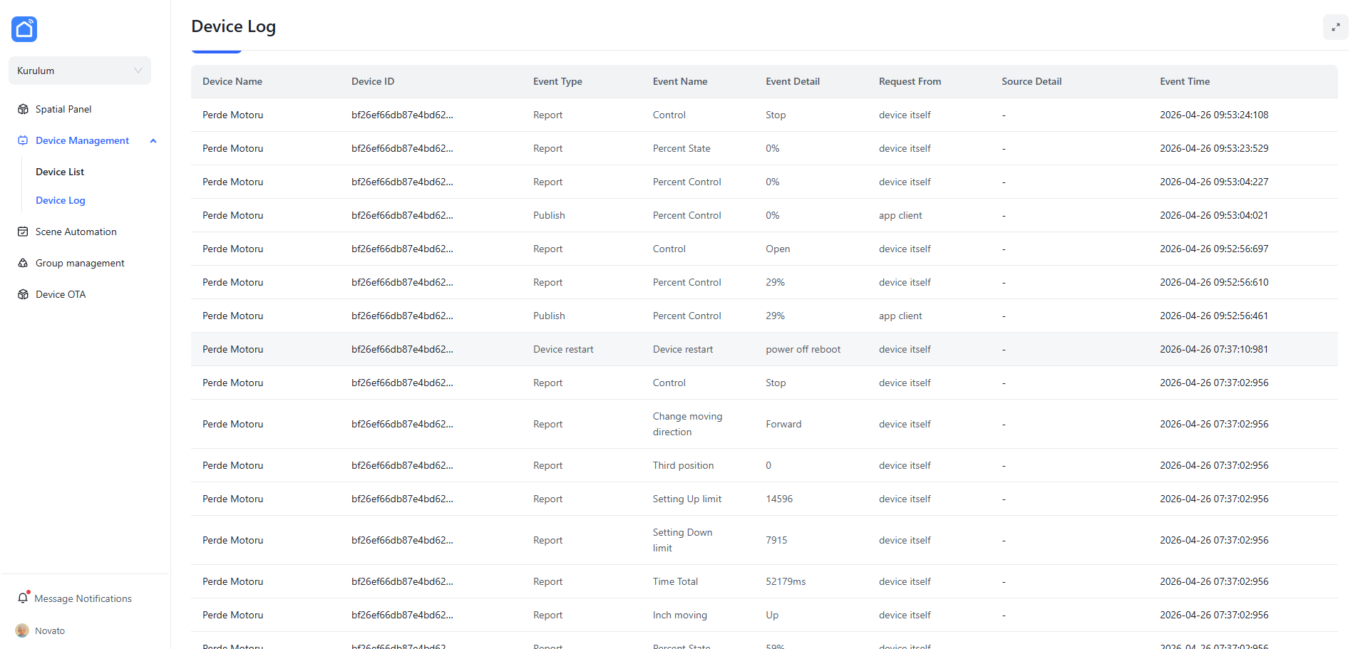 Akıllı ev kurulumlarında en sık sorulan sorulardan biri “Bu cihaz tam olarak ne zaman, kim tarafından, hangi komutla çalıştırıldı?” sorusudur. Yeni panelin Device Log sayfası bu soruya tam yanıt verir.