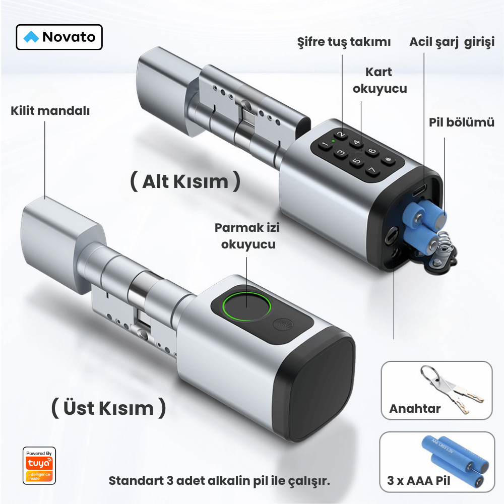 Tuya, Smart Life uyumlu, Bluetooth bağlantıya sahip, parmak izi, şifre, kart okuyucu özelliklerine bulunan ,3 adet standart AAA pil ile çalışan akıllı kilit.
