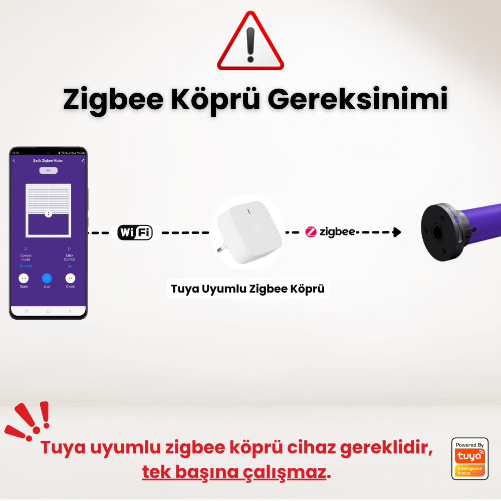 Tuya, Smart Life uyumlu Zigbee köprüler ile çalışan, dahili bataryalı,elektronik limit ayarlı, RF kumanda destekli, Zigbee bağlantılı şarjı perde motoru.