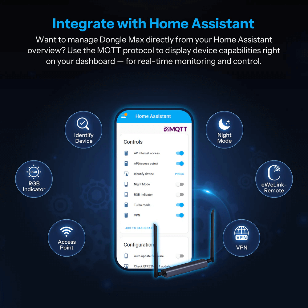 • Protokoller: MQTT, eWeLink-Remote Gateways, Webhooks, WireGuard VPN.