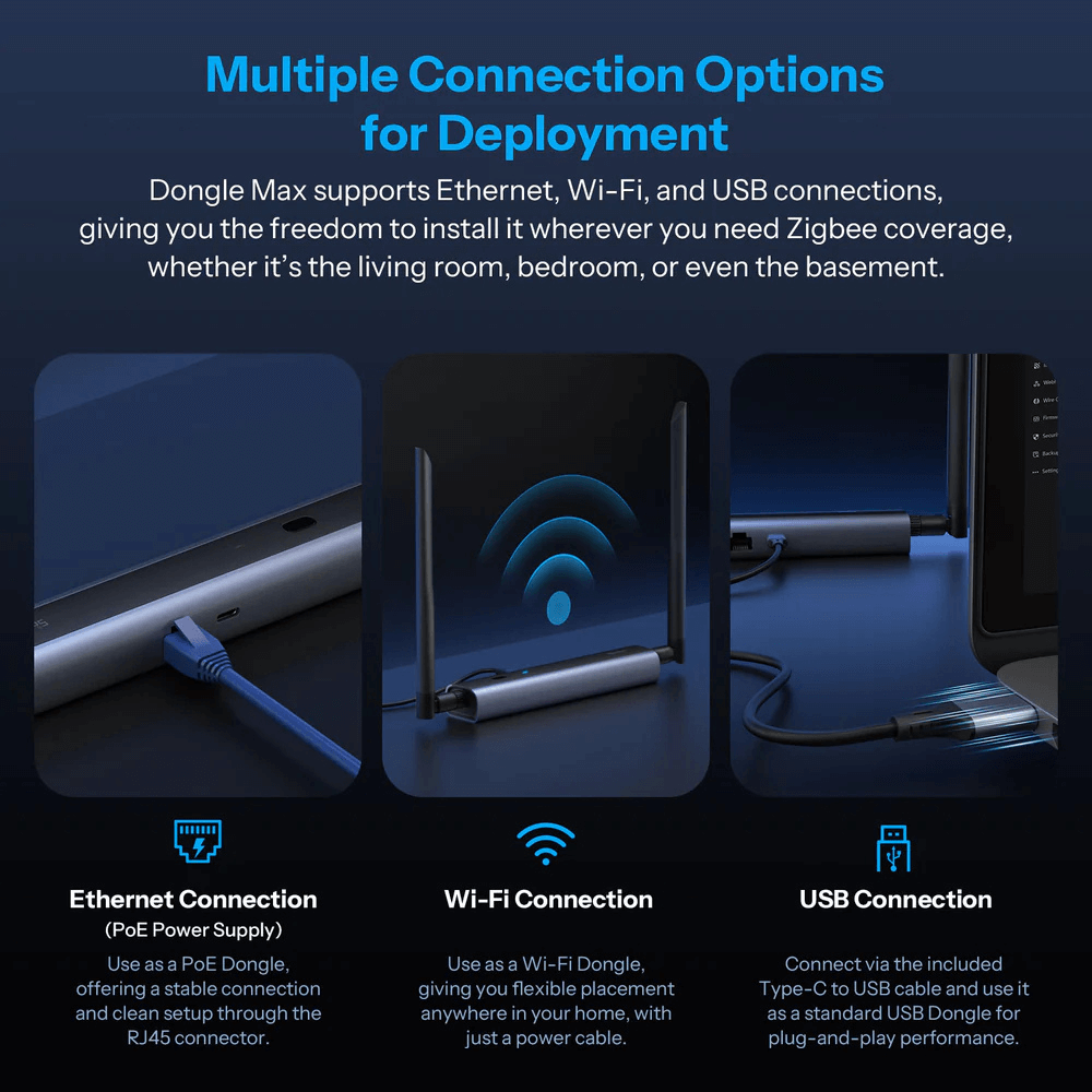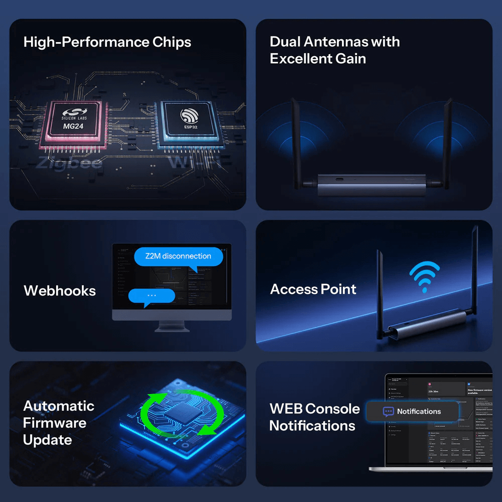 Zigbee ve Thread bağlantılarını destekleyen, Ethernet, Wi-Fi veya USB üzerinden çalışabilen, EFR32MG24 ve ESP32D0WDR2 çiplerine sahip, 360° kapsama sağlayan çift antenli dongle.