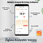 Tuya Uyumlu Zigbee Radyatör Vanası, evinizin ısıtma sistemini tam kontrol altına alabilmeniz için tasarlanmış akıllı bir termostat çözümüdür. Gelişmiş sıcaklık kontrolü ve enerji tasarrufu teknolojisini bir araya getiren bu ürün, Zigbee ağ geçidiyle (hub) birlikte kullanıldığında, telefonunuzdaki uygulama ya da sesli asistan aracılığıyla oda sıcaklığını dilediğiniz gibi ayarlamanızı sağlar. Bu sayede günlük konforunuzdan ödün vermeden enerji faturalarınızı düşürebilir, esnek planlamalar yapabilir ve her koşulda verimli bir ısınma deneyimi yaşayabilirsiniz.