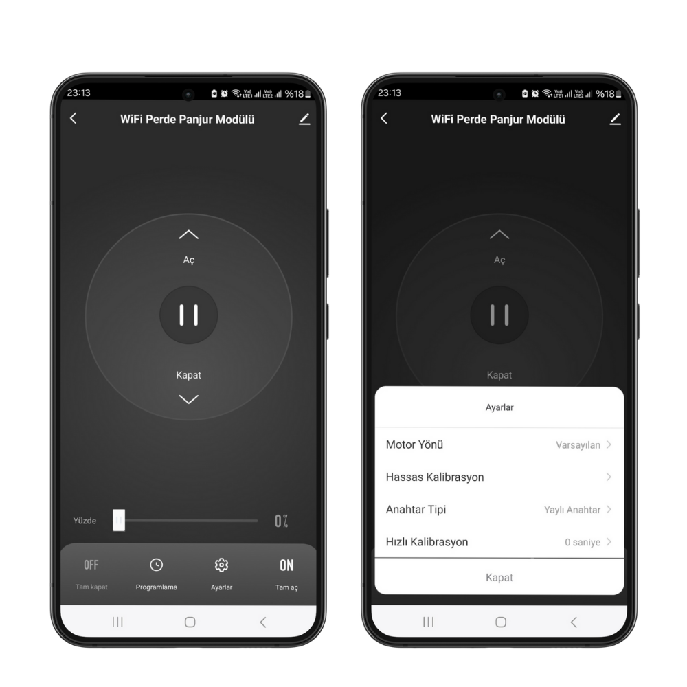 İki kalibrasyon modu desteklenir: hassas kalibrasyon ve hızlı kalibrasyon. Kalibrasyonu motor hareketine veya girdiğiniz motor hareket süresine göre gerçekleştirebilirsiniz. Uygulamada motorların dönüş yönünü ayarlayabilir ve akıllı perde modüllerini, motorların dönüş yönünden bağımsız olarak perde motorlarına bağlayabilirsiniz.