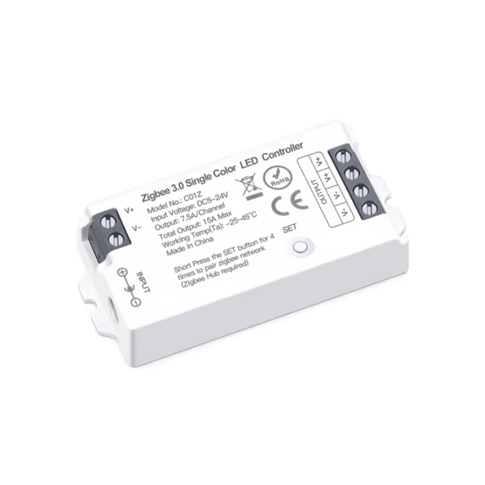 Tuya uyumlu Zigbee 3.0 bağlantıya sahip şerit led kontrolcüsü. 5-24V Voltaj ile çalışır, çıkışına bağlanan led uzaktan açıp kapatılabilir,programlanabilir ve parlaklığı ayarlanabilir.