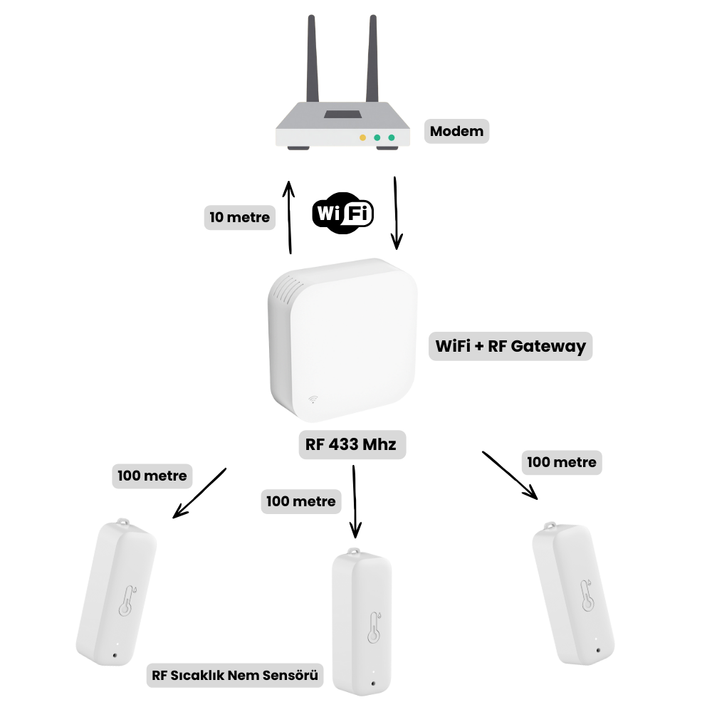 Mesafe: WiFi Ağ Geçidi ile modeminiz arasındaki mesafe en fazla 10 metre, sensör ile gateway arasındaki mesafesi max 130 metre olmalıdır.