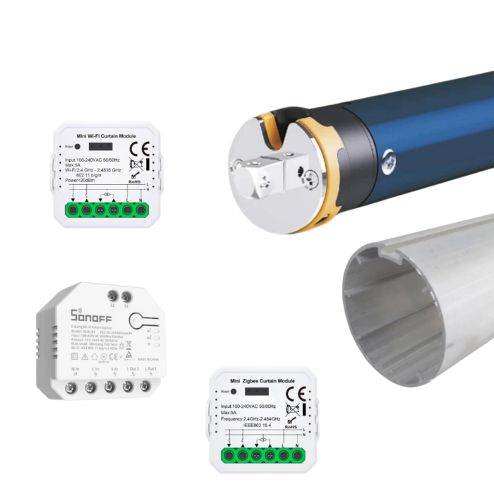 Bu set ile var olan stor perdenizi ev ortamında motorlu sisteme çevirebilir,röle seçimize göre WiFi ya da Zigbee bağlantı üzerinden perdelerinizi kontrol edebilirsiniz.